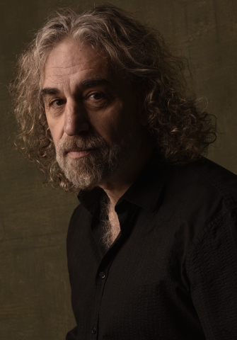 John Hodian sits in the middle of 6 members of the Naghash Ensemble that wears all black and traditional clothes.
