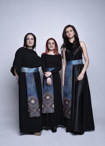 3 female members of the Naghash ensemble stand together wearing all black and turquoise patterned cloth worn on their waists.